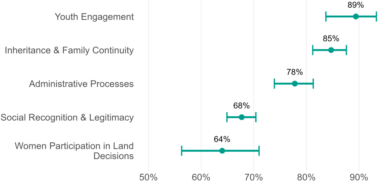 Youth show greater interest as future ownership becomes more concrete, and women are increasingly named on documents, particularly in joint certificates. At the same time, decision-making authority largely remains with elders and men. These shifts are real, but fragile, and depend on local and family dynamics.
