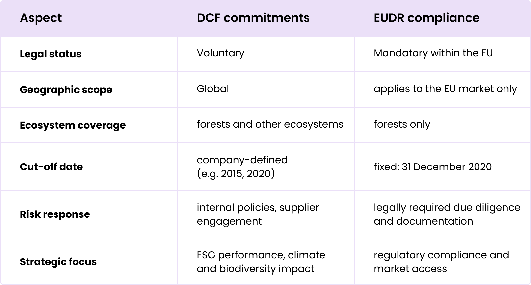 EUDR compliance and DCF commitments are not interchangeable. The EUDR provides a legal baseline for EU trade, while DCF commitments reflect broader environmental values and typically cover additional ecosystems and regions beyond the EU.
