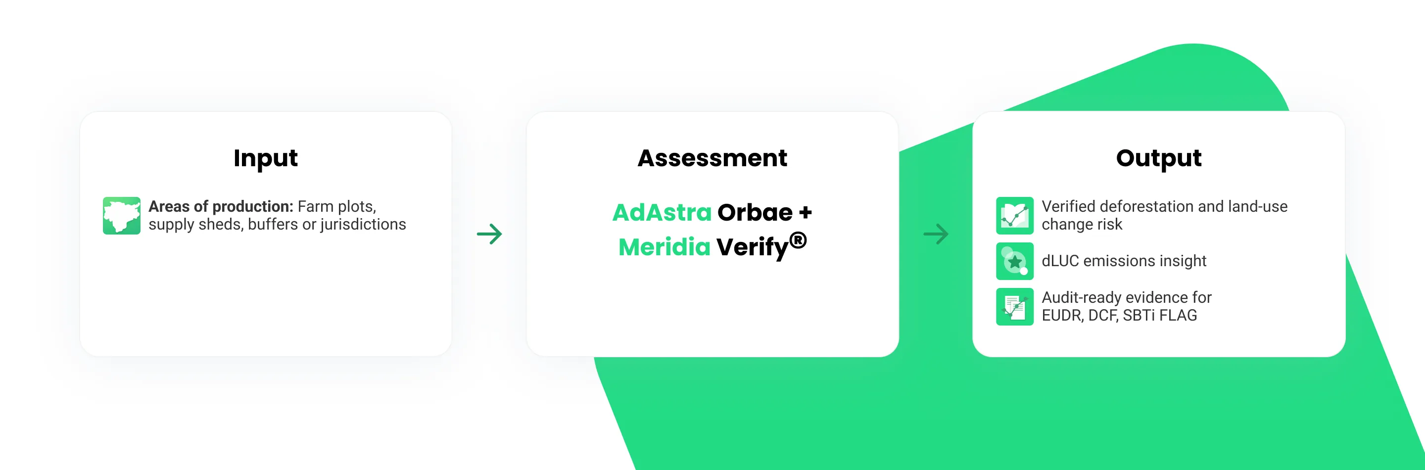 Meridia Verify independently assesses farm and area-level data for legality, deforestation exposure, land-use change, and data quality using an EY-audited methodology. AdAstra’s Orbae technology complements this by quantifying emissions from direct land-use change (dLUC) in high resolution across farms, sourcing regions or entire jurisdictions.